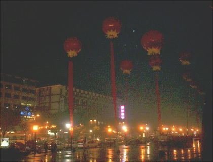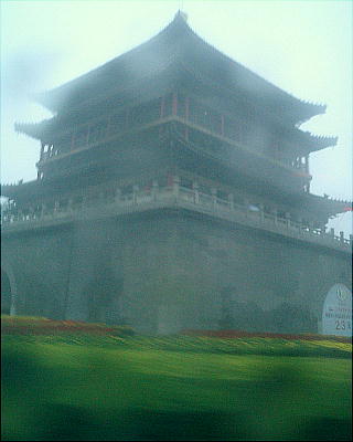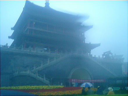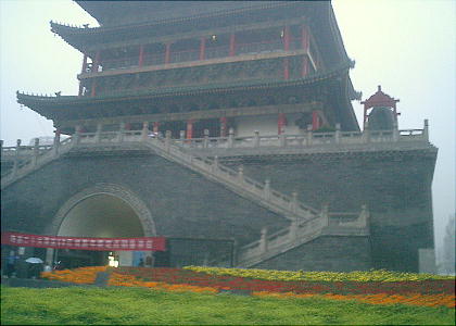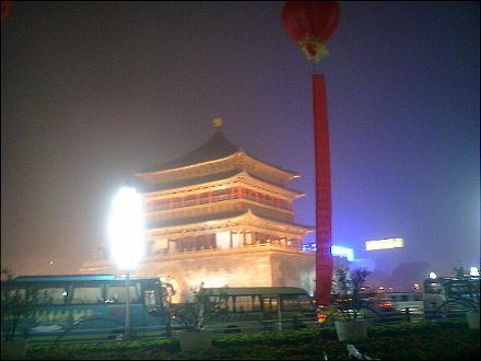 西安の市街地どまんなかにある、鐘楼(しょうろう、鼓楼(ころう)の脇を通って今晩の夕食の店へ行く。でかい料理店に