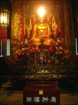 大雄宝殿の本尊「釈迦如来坐像」。この金銅仏像は清代のもの。台座は3種の千体仏でできている。