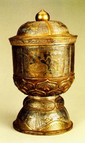 銀鍍金 人物禽獣文高脚香入れ(ぎんときん じんぶつきんじゅうもん こうきゃくこういれ)唐時代 9世紀