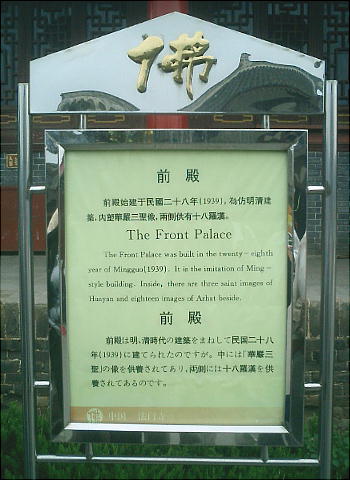 前殿。1939年再建。華嚴三聖像と18羅漢がまつられている。