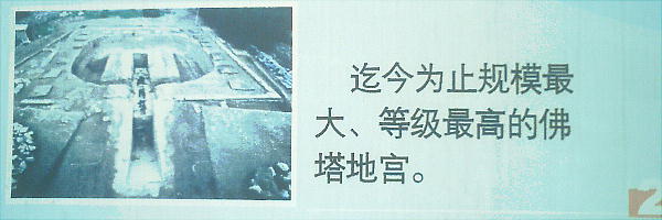 法門寺塔が1981年に西半分が崩れたので、再建するため1985〜1987年に取り壊した時、塔の基礎部分に地宮