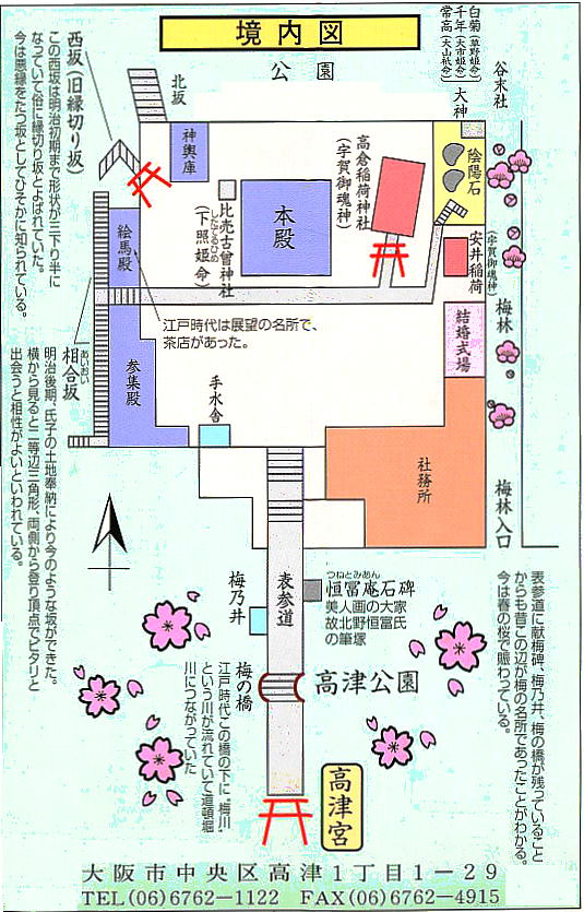 少し行った府立高津高校の正門北側に「高津宮跡」の石碑がある。正門を入ったすぐ左の庭園にあり、これは江戸期の資料によ