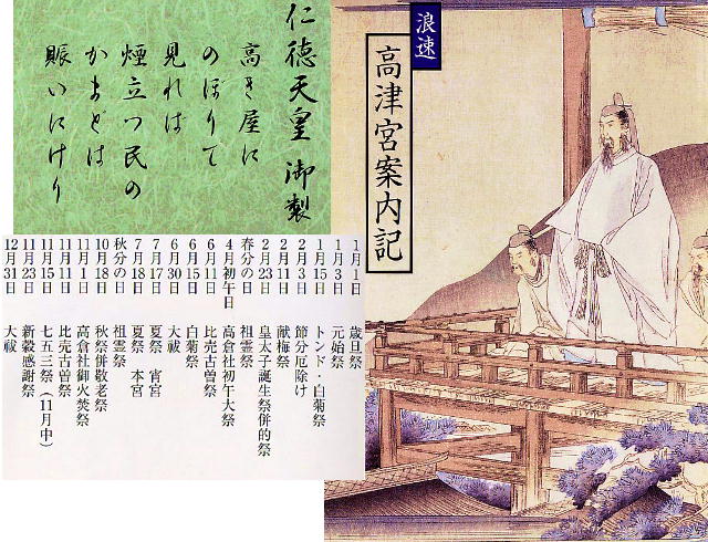 記紀では仁徳天皇は、その諱名にも表われているように、「仁」と「徳」の聖王として描かれている。高殿から人々の生活を視