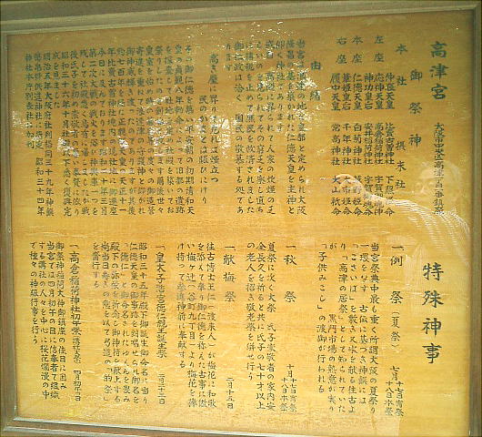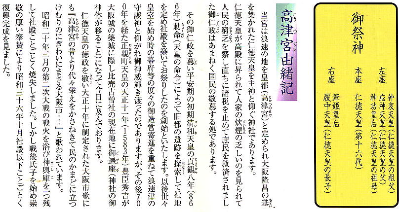 この高津宮は仁徳天皇を主祭神とし、仲哀・応神・履中天皇、神功・葦姫皇后を祀る。平安期初め、清和天皇の勅命により、貞