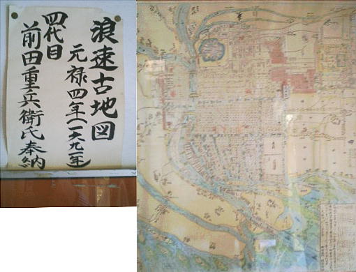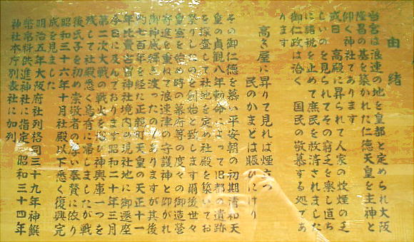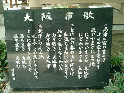 堂には仁徳帝の「高き屋にのぼりて見れば畑立つ 民のかまどは賑ひにけり」の御歌の額が掲げられている。上の大阪市歌のー