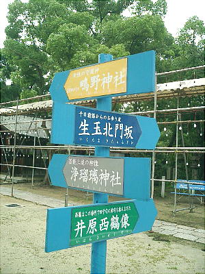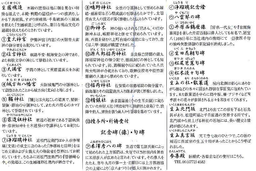 昔この神社前の馬場は、近松門左衛門の「生玉心中」や「心中宵庚申」、「曽根崎心中」などに描かれた心中の舞台でもあった。
