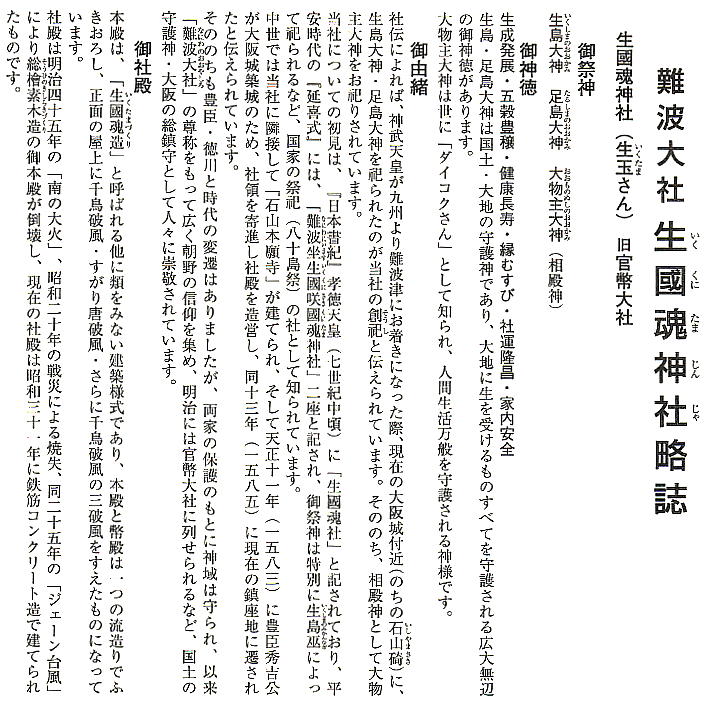 伊弉諾尊と伊弉冉尊の子神である、生島(いくしま)神・足島(たるしま)神を祀る。延喜式名神大社である。正式には【難波