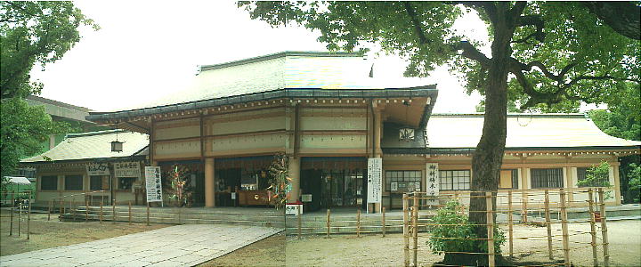 第二次大戦の空襲で全焼した。現本殿は昭和31年再建の鉄筋コンクリート造だが、千鳥破風の上に唐破風、その上に千鳥破風