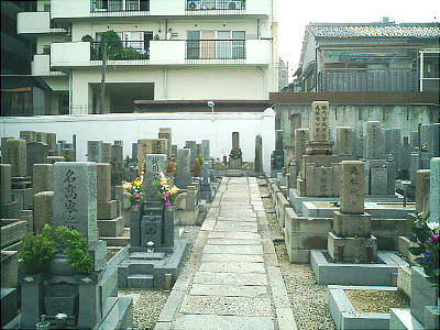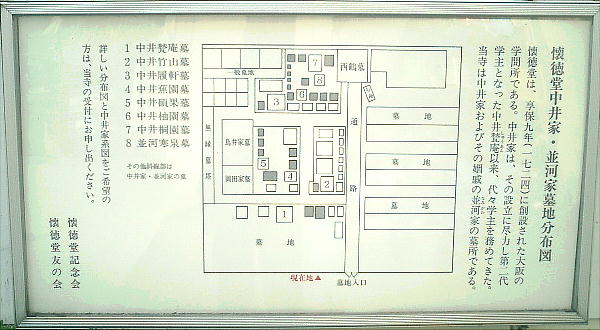 幸田露伴らが、境内の無縁墓におしこめられていたのを発見した。また境内には、懐徳堂を開いた中井一族の墓もある。