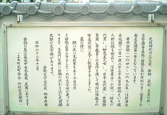 【この項、「日本の墓」ホームページ「井原西鶴の墓」より転載。Copyright(c) 2001 KOHTOKU. All Rights Reserved. 】