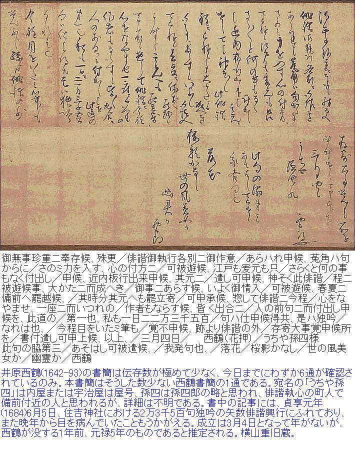 浮世草子の創造者である井原西鶴(〜1693)は、寛永19年(1642)大坂に生れる。本名を平山藤五といい、大坂の比較的裕福な町人