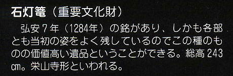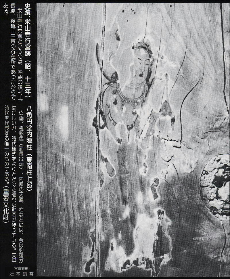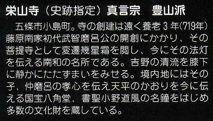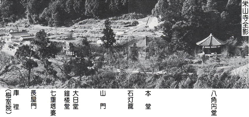 には国宝八角堂・梵鐘、および重要文化財の石灯籠・石塔婆が残っている。又、栄山寺行宮跡というのは、南朝の後村上、