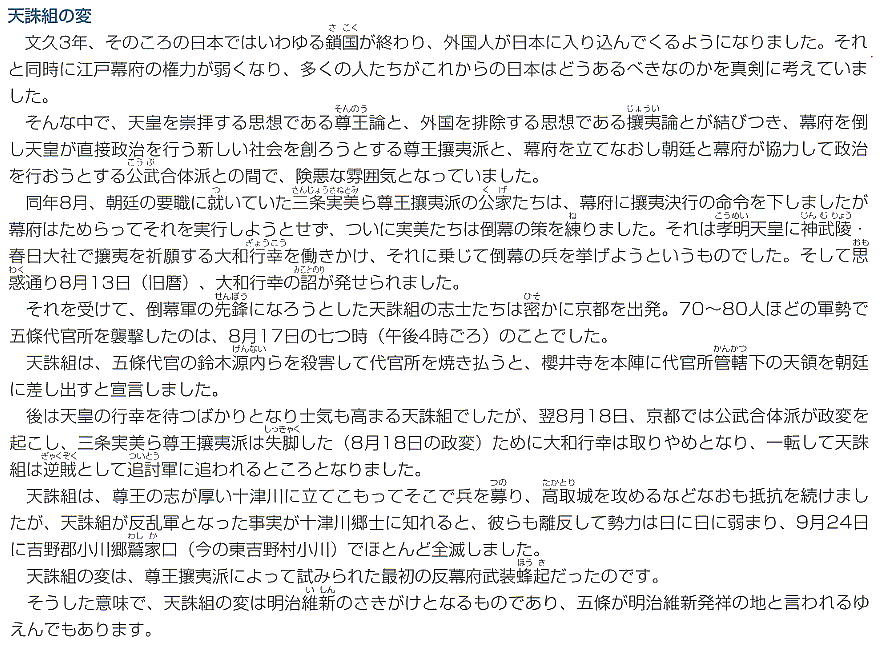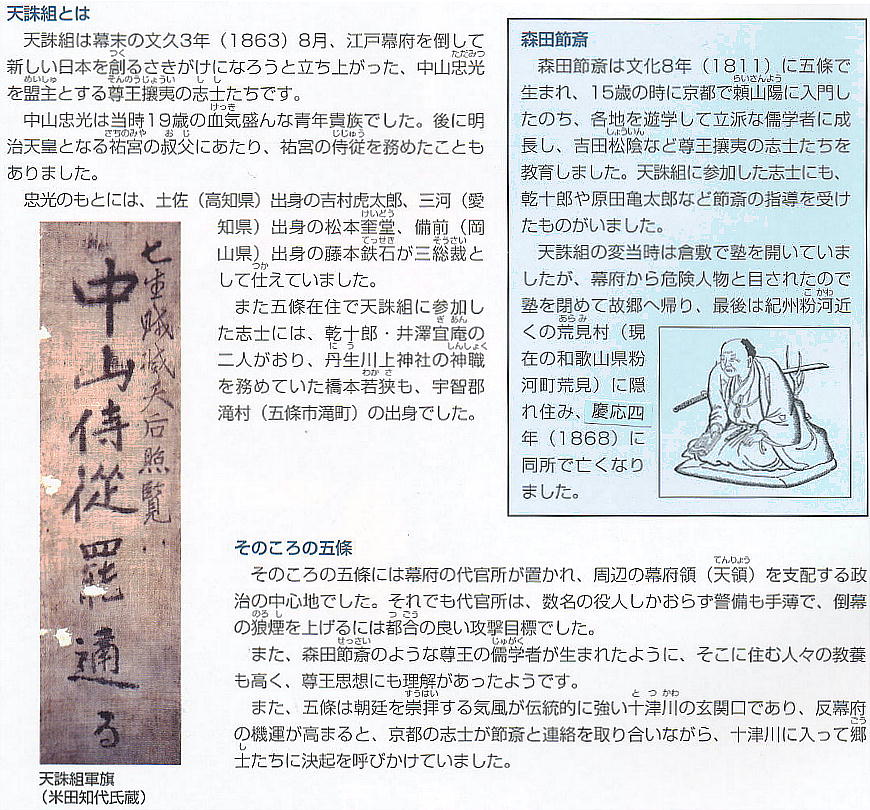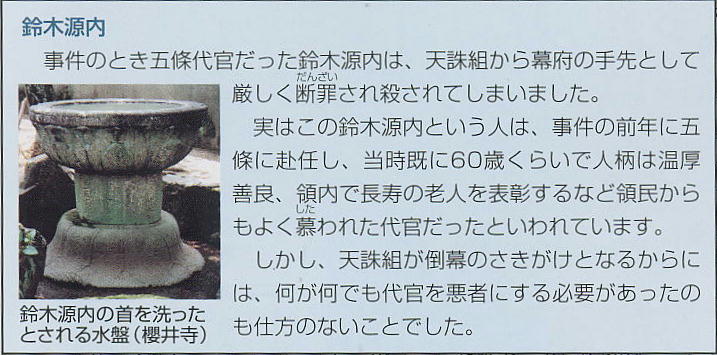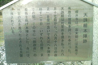 櫻井寺(さくらいじ) 奈良県五條市須恵1−3−26 TEL:07472-2-3165 天暦年間(947〜957)桜井康成の創建と伝える古刹。天誅組は桜井寺を本陣として五條仮政府と号した。浄瑠璃の艶容女舞 衣の三勝、半七の塚がある。