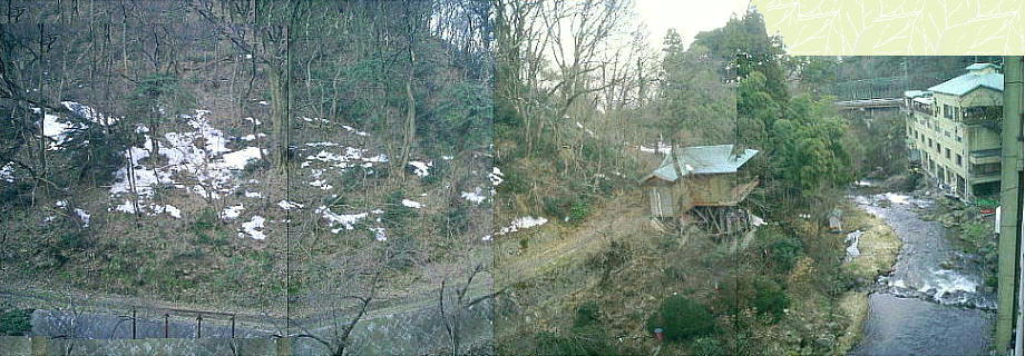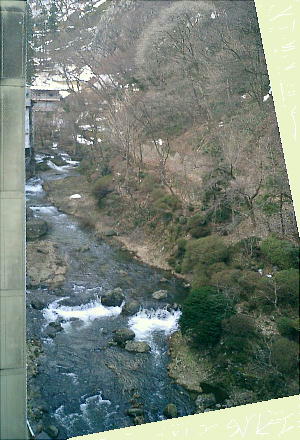 これも部屋から写したホテル横の川、下流部分と向かいの山。木々の間にはまだ雪が残り、右手のほうに小さく