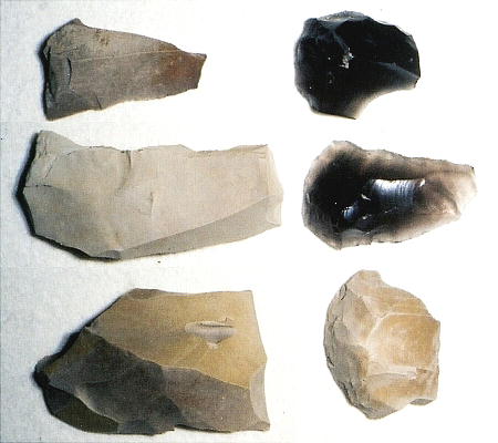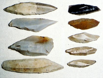 ナイフ形石器 (上左)と、エンドスクレイパーと彫刻刀形石器(上右:いずれも高郷村塩坪遺跡)