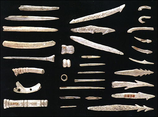 < 三貫地貝塚出土骨角器> (さんがんじかいづか)縄文時代後・晩期 約2500年〜4000年前