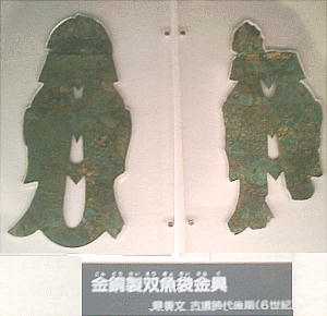 2匹の魚が腹を合わせる意匠の金銅製双魚佩金具が出土。鱗や鰭は小さな工具によって打ち出され、目の部分は表か