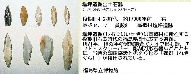 耶麻郡高郷村の塩坪遺跡は、後期旧石器時代の福島県を代表する旧石器時代の遺跡で、今から1万5,000〜1万4,000