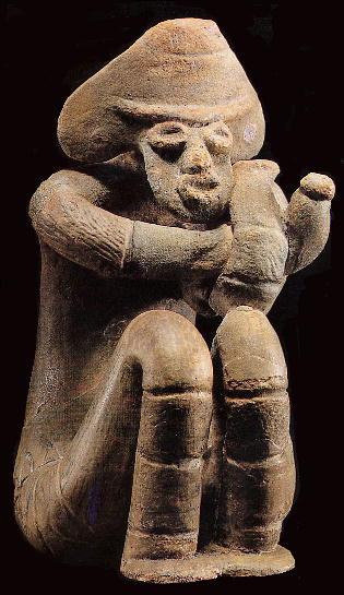 縄文時代にはさまざまな土偶が造られた。この土偶は前屈みに座って右手を左腕に挟んで、左手で頬杖をついた、非常