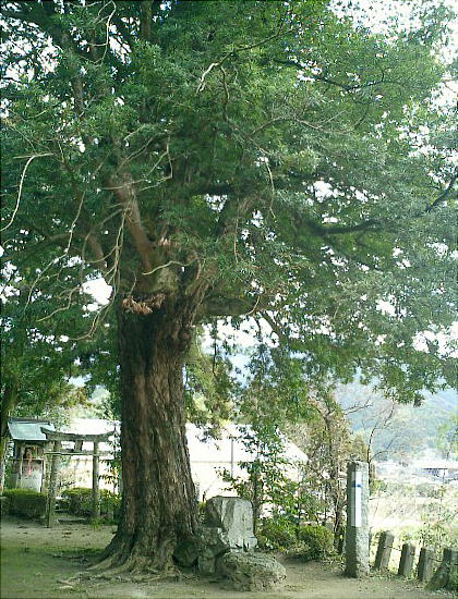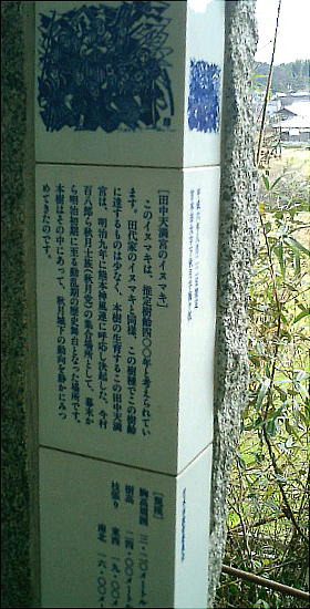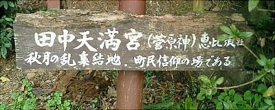 ここ田中天満宮は幕末から明治初期に至る動乱期の歴史舞台となった場所である。右奥に推定樹齢400年のイヌマキがあり、