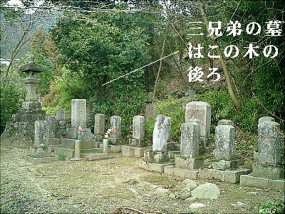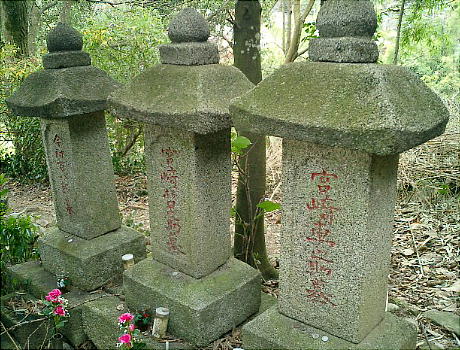 長生寺の、秋月の乱首謀者宮崎三兄弟の墓(右手から、宮崎車之助・宮崎伊六・今村百八郎)