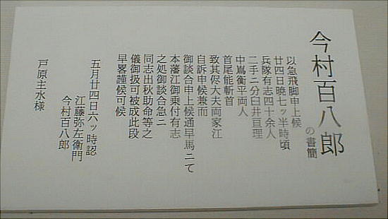 上下の書簡は、干城隊が臼井亘理、中嶌衡平を暗殺したことを戸原主水に知らせたもの。