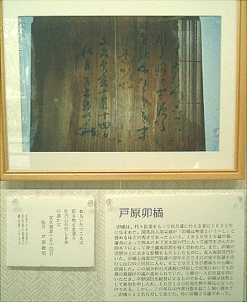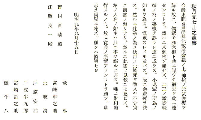 以下は、前述、丸元淑生著「秋月へ」に紹介されている文章である。この文章は、彼の曾祖父に宛てた秋月の士族団体から来た、