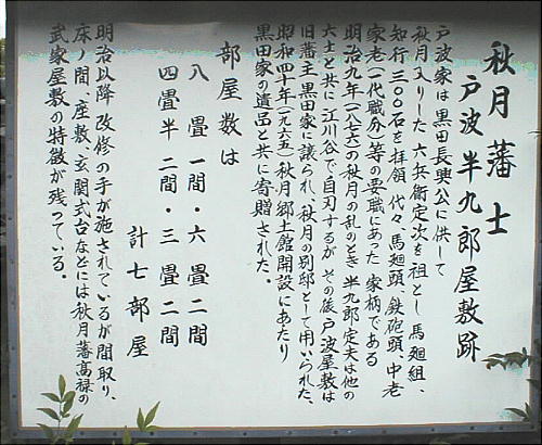 秋月の代表的な武家屋敷であった「戸波家」(秋月藩上級武士)の旧屋敷と庭園が、現在秋月郷土館として公開されている。廷内に