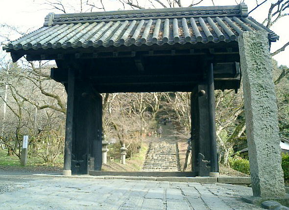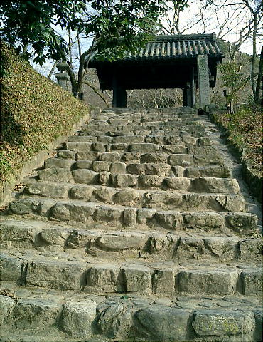 な石段があり、その上に重厚な構えの「黒門」がある。