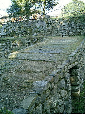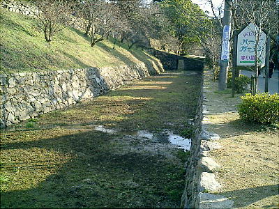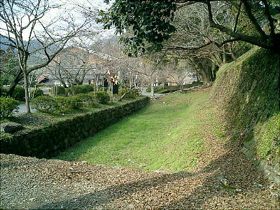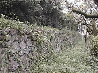 主郭掘割 上左の写真、石垣の脇に小道があって遅刻したらここから駆け上っていたが、よく上に先生が待っていた。
