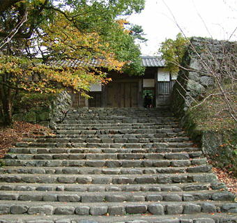 と石積みを見ながら進み、中学校の正門を行きすぎると、左手石段の上に秋月黒田藩時代の勝手門であった「長屋門」が見える。