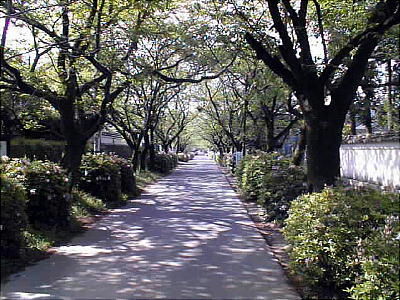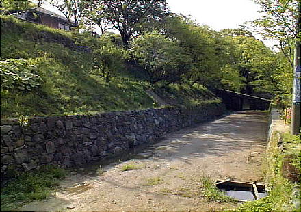 堀が切れたところに中学校への坂道(上左)がある。私は結婚したときWIFEにこの中学校を見せたくて、結婚式場だった福岡の教会