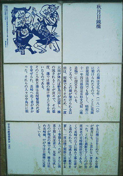 秋月藩八代藩主長舒(ながのり)は、長崎警護の任に当たった折、長崎で堅固な石橋を見て(眼鏡橋)これを秋月の野鳥川にかける