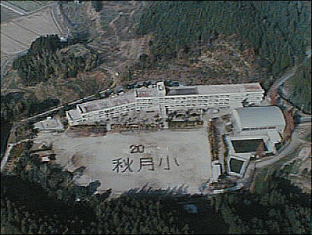 この新しい秋月小学校(上右)は、今、私の実家の真向かいの山の上に建つ。生徒数減から江川、上秋月、安川の小学校が併合された。