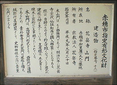 は、もと西惣門であったものを明治6年(1873)に花岳寺21代仙珪和尚が購入移築したものであり、平成3年(1989)3月に市指定