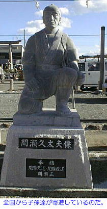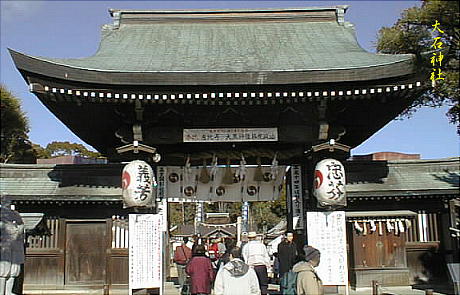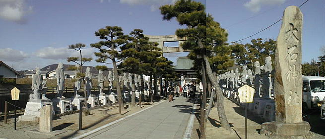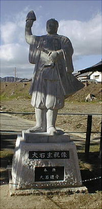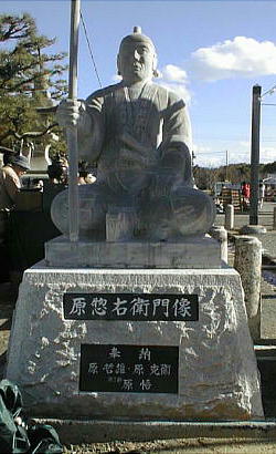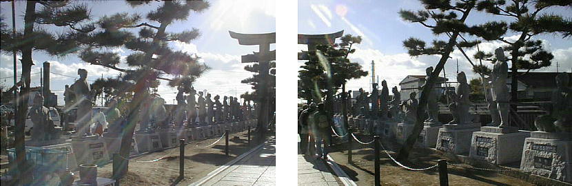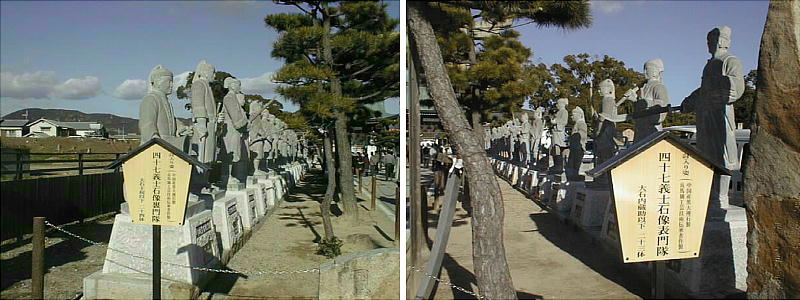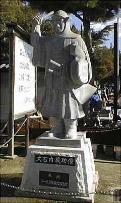 門前には、大石内蔵助を筆頭に47士の石像が並んでいる。銘板に刻まれた文句を見ると、それぞれの子孫達が寄進して石像を造った