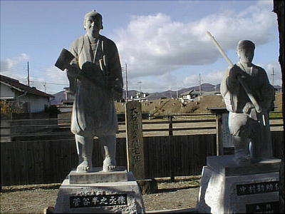 下左の石像の間に見える広場が、大石瀬左衛門の屋敷跡だ。どうしてこの場所に瀬左衛門像を持ってこなかったんだろう。