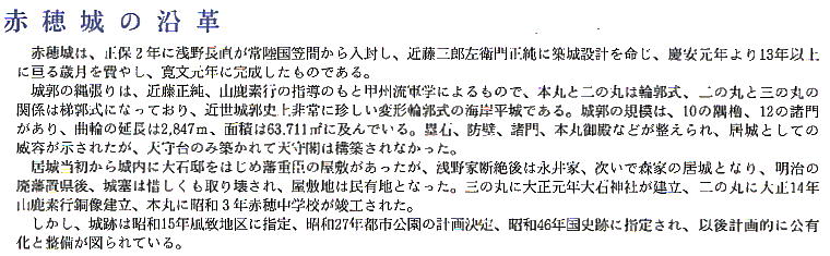Music: 討ち入り前夜 −赤穂浪士の街− 赤穂城祉 ここでの資料一式は、赤穂市教育委員会発行の「国史跡赤穂城祉 本丸庭園」からの転載である。記して謝意を表す。 念願かなって、3年後の連休にやっと見に行った「赤穂城祉」