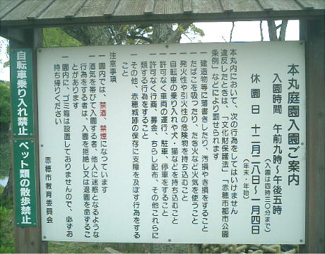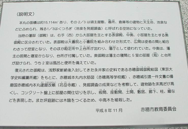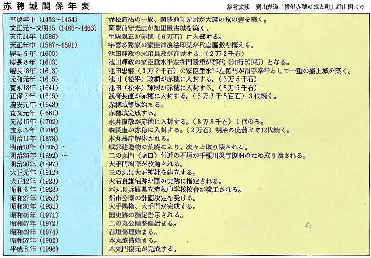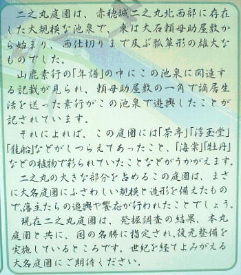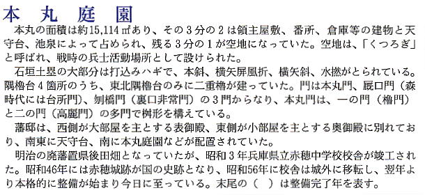 ここでの資料の一部は、赤穂市教育委員会発行の「国史跡赤穂城祉 本丸庭園」から転載した。記して謝意を表す。