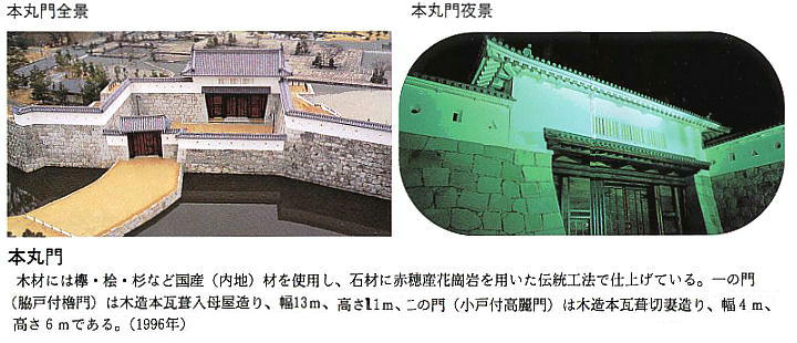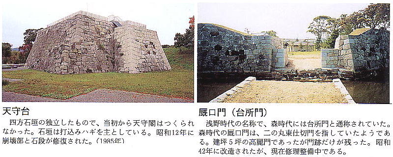 浅野家断絶後は、永井家、森家の藩主の居城となり、現在、石垣、大手門や隅櫓のほか、本丸門が平成8年に復元され、