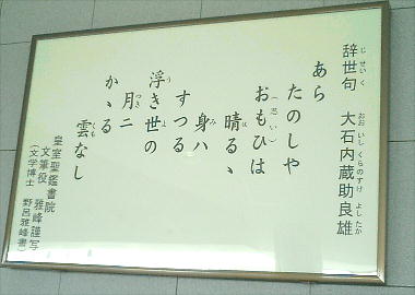 大石内蔵助や浅野内匠頭の辞世の句、仮名手本忠臣蔵の47士像なども健在だった。