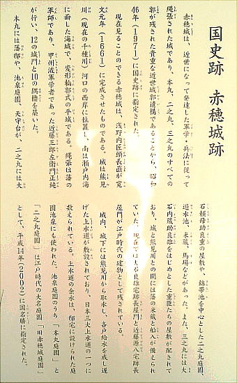 がそこう)が築城に参加した。長直の孫長矩のとき、忠臣蔵で有名な、殿中刃傷事件が起こり浅野氏は改易となる。