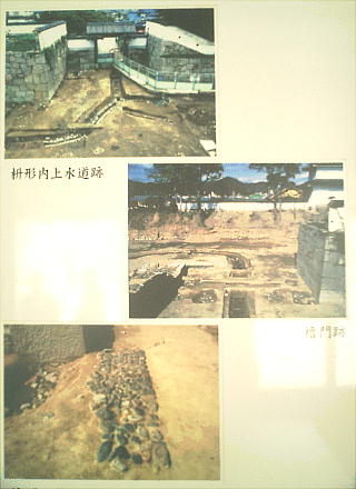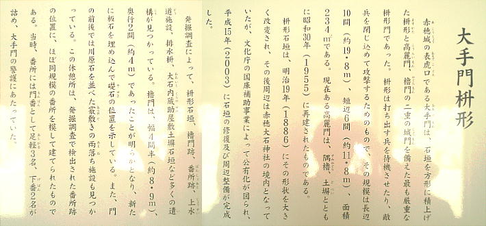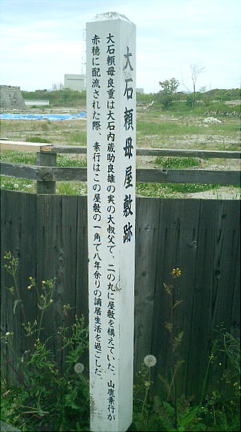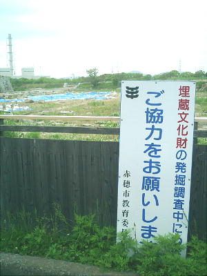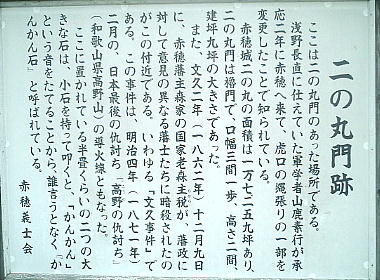 じる門である。城跡は大石神社より更に左手奥へ歩く。外堀もあり、その周辺も発掘作業中で、やがて、浅野時代の往