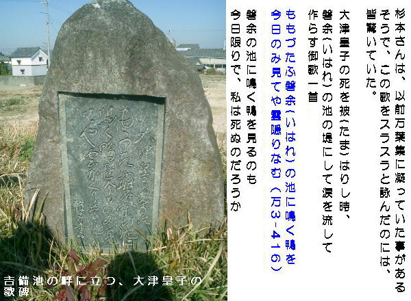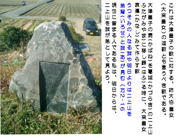 この北西に、わずかに大津皇子と大伯皇女の歌碑が建っている。華々しく報道されて注目を浴びた遺跡にしては変