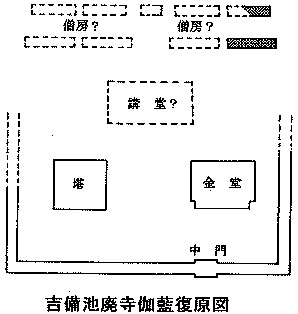藍配置の最古の例になるという。また回廊が一辺100m以上と規模が大きいことから、同廃寺が、巨大な寺とさ