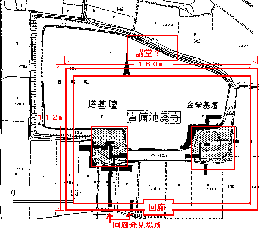 寺域は東西約230b、南北290b以上の可能性が強いという。吉備池廃寺はこれまで塔や中門、回廊など主要部分の