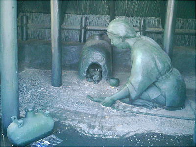 次の塩をとりだす工程は、濃縮した塩水を土器に入れ、炉の上に並べて煮詰め、水分を蒸発させて、残った塩だけを