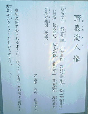 万葉集に「名寸隅(なきずみ)の 船瀬(ふなせ)ゆ見ゆる 淡路島 松帆(まつほ)の浦に 朝凪(あさなぎ)に
