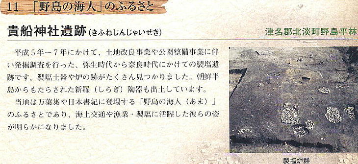 遺跡の周辺は野島と呼ばれ、その地名から『日本書紀』や『万葉集』にも記載がある「野嶋海人(のじまのあま)」と