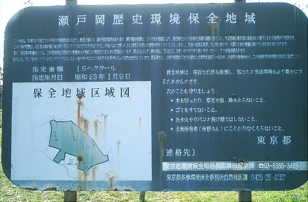 説明板によると、瀬戸岡古墳群は「弥生時代から古墳時代末期の遺跡」で、「都下における有数の古墳群」となってい